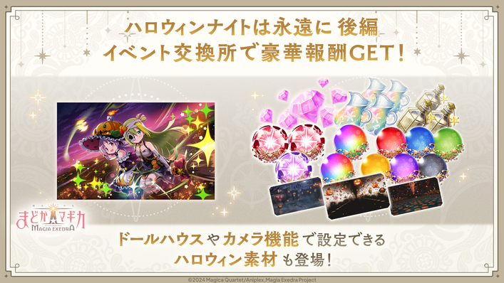 イベント交換所は「マギカストーン」や「オープンヴェイス」、「プリズムオーブ」など様々なものと交換いただける他、ハロウィンイベントで登場する、魔女結界や2D背景、BGM、光の間のギャラリーでご覧いただける魔女の手下の情報など、前編とは別のものを新たに交換いただくことができます。ドールハウスやカメラなどでも使用可能です。
