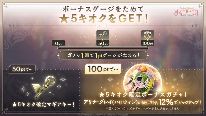 本ガチャには「ボーナスゲージ」が付いており、ガチャ1回で1Ptゲージがたまります(10連ガチャで10Pt)。100Ptに達するとピックアップ対象も封入された★5キオク確定のボーナスガチャを1回引くことが可能です。
