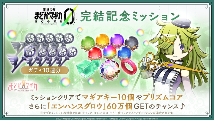 『魔法少女まどか☆マギカ scene0』 完結を記念して、「魔法少女まどか☆マギカ scene0完結記念ミッション」を開始いたしました。ログインや、今回追加されるscene0完結編の「愛生まばゆの記憶 後編」MainのBOSSバトルクリアなどのミッションを達成することで、最大でガチャ10連分のマギアキーが獲得できます。また、プリズムオーブやプリズムコアなどの育成素材なども獲得可能です。
