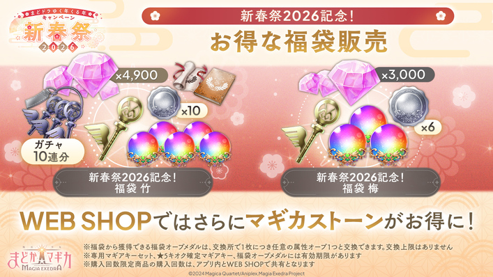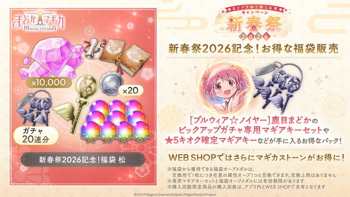2026年1月1日(木)0時より、お得な福袋の販売を開始し、「新春祭2026記念!福袋 松」では、マギカストーンと[プルウィア☆ノイヤー]鹿目まどかのピックアップガチャ専用マギアキーセット、★5キオク確定マギアキーなどが手に入ります。