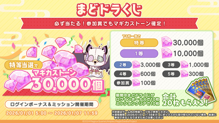 2026年1月1日(木)5時より、特等当選でマギカストーン30,000個を手に入れることができ、参加賞でも必ずマギカストーンが当たる「まどドラくじ」を合計20枚獲得いただけます。「まどドラくじ抽選チケット」は1枚ごとに番号が記載されており、その番号と当選番号が見事一致した場合、一致した等の景品が獲得できます。