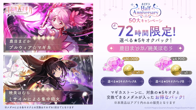 9月28日(日)20:00より、ハーフアニバーサリーを記念して、「選べる★5キオクパックA(鹿目まどか/暁美ほむら)」「選べる★5キオクパックB(鹿目まどか/暁美ほむら)」を販売いたします。