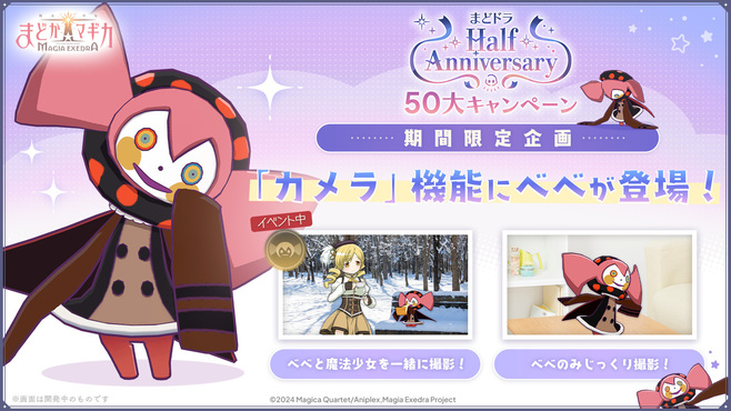 9月28日(日)20:00より、ハーフアニバーサリーを記念して、先日リリースした新機能「カメラ」にべべが期間限定で登場いたします。「カメラ」機能は、所持しているキオクから好きな魔法少女を選び、一緒に「おでかけ」して撮影できる新機能となっています。