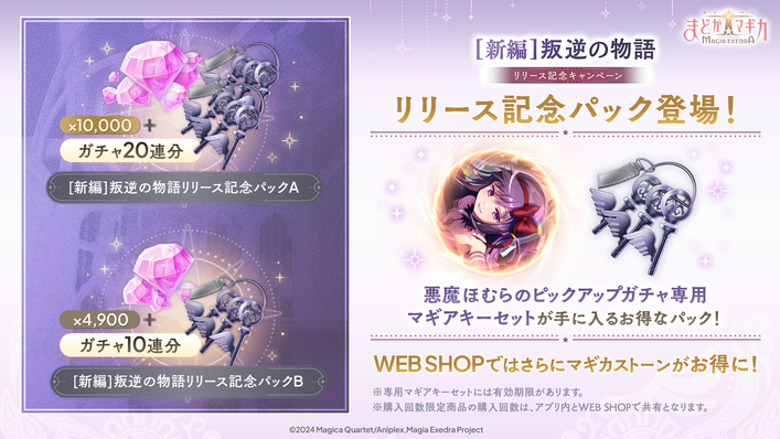 各パックは、アプリまたはWEBSHOPのどちらかで1回ずつご購入いただけます。WEBSHOPでは、同じ価格でマギカストーンが増量され、お得となっております。