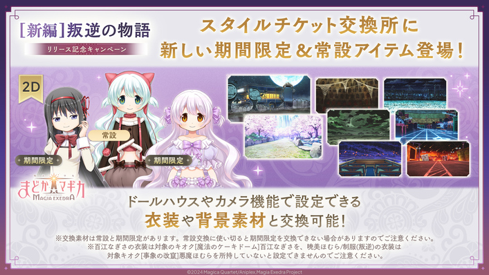 「スタイルチケット交換所」では、[新編]叛逆の物語 後編イベント開催に合わせて、新たに百江なぎさのキオクに紐づく2D衣装を交換いただくことができるようになります。また、期間限定で悪魔ほむらのキオクに紐づく2D衣装と、百江なぎさのMagia Day 2025 2D衣装も交換できます。