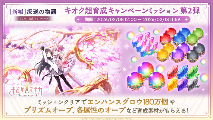2026年2月8日(日)12時より、キオク超育成キャンペーンミッション第2弾を開始します。第1弾から第3弾まで開催予定となっており、育成素材が大量に獲得できるミッションです。ログインや強化クエストクリアなどのミッションをクリアすることで、エンハンスグロウや各種オーブなど、育成素材を獲得することができ、第1弾~第3弾あわせてプリズムオーブは最大50個以上獲得することが可能です。