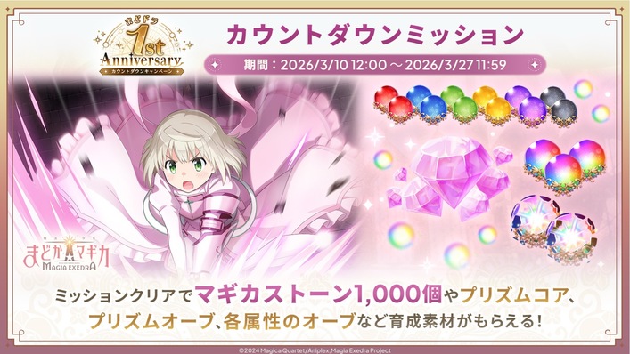 2026年3月10日(火)12時より、1st Anniversaryカウントダウンミッションを開催中です。魔法少女たると☆マギカ 前編のMainモードのBOSSを倒すなど、各ミッションをクリアで、マギカストーン1,000個や、「プリズムオーブ」などを獲得できます。